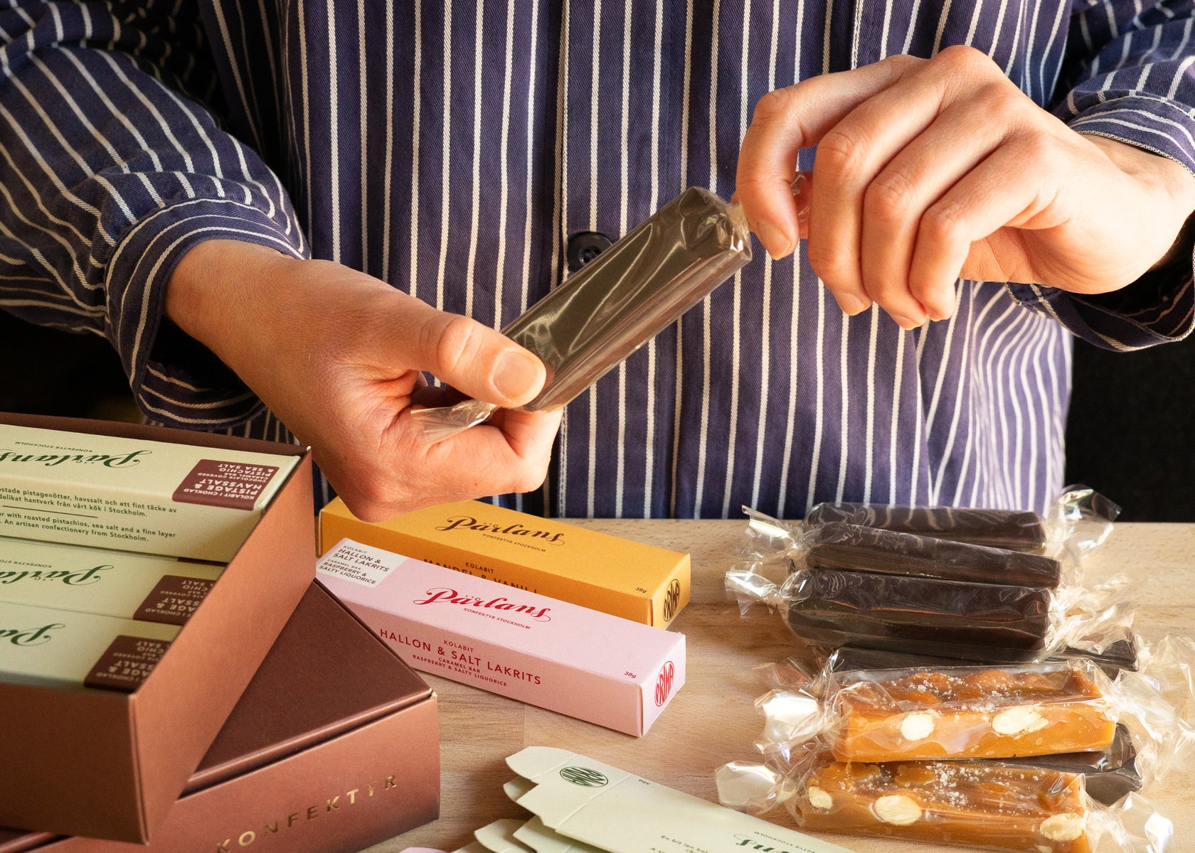 At Pärlans Konfektyr we are dedicated to a delicate craft. Our caramels and caramel sauce are made with cream, butter and sugar - no frills, just pure, simple ingredients. An eye for detail and a love of craftsmanship produce a quality beyond the ordinary. With a wink to the glory of bygone times, we create contemporary classics our way. A passion for top-quality sweets is our melody, and it can be heard both in our shop in Södermalm and all the way to our caramel-scented factory in the Slakthus area of Stockholm.