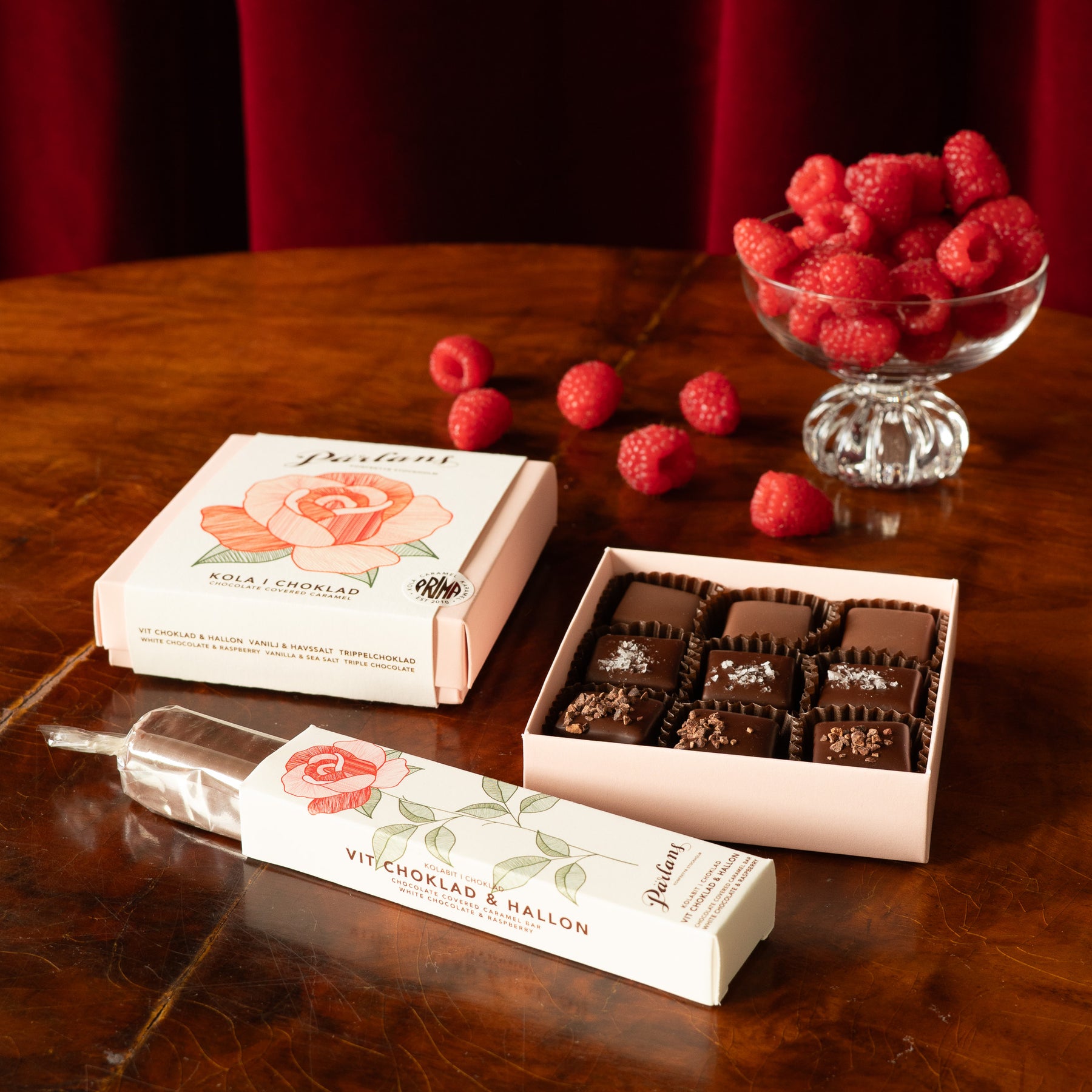 Nio bitar mjuk kola doppad i ekologisk choklad - i den här asken hittar du två av våra klassiker TRIPPELCHOKLAD i mörk choklad, VANILJ & HAVSSALT i mörk choklad och nykomlingen HALLON & VIT CHOKLAD i mjölkchoklad.