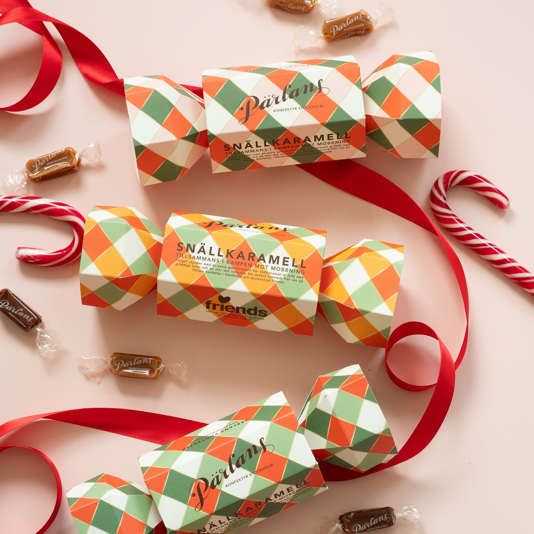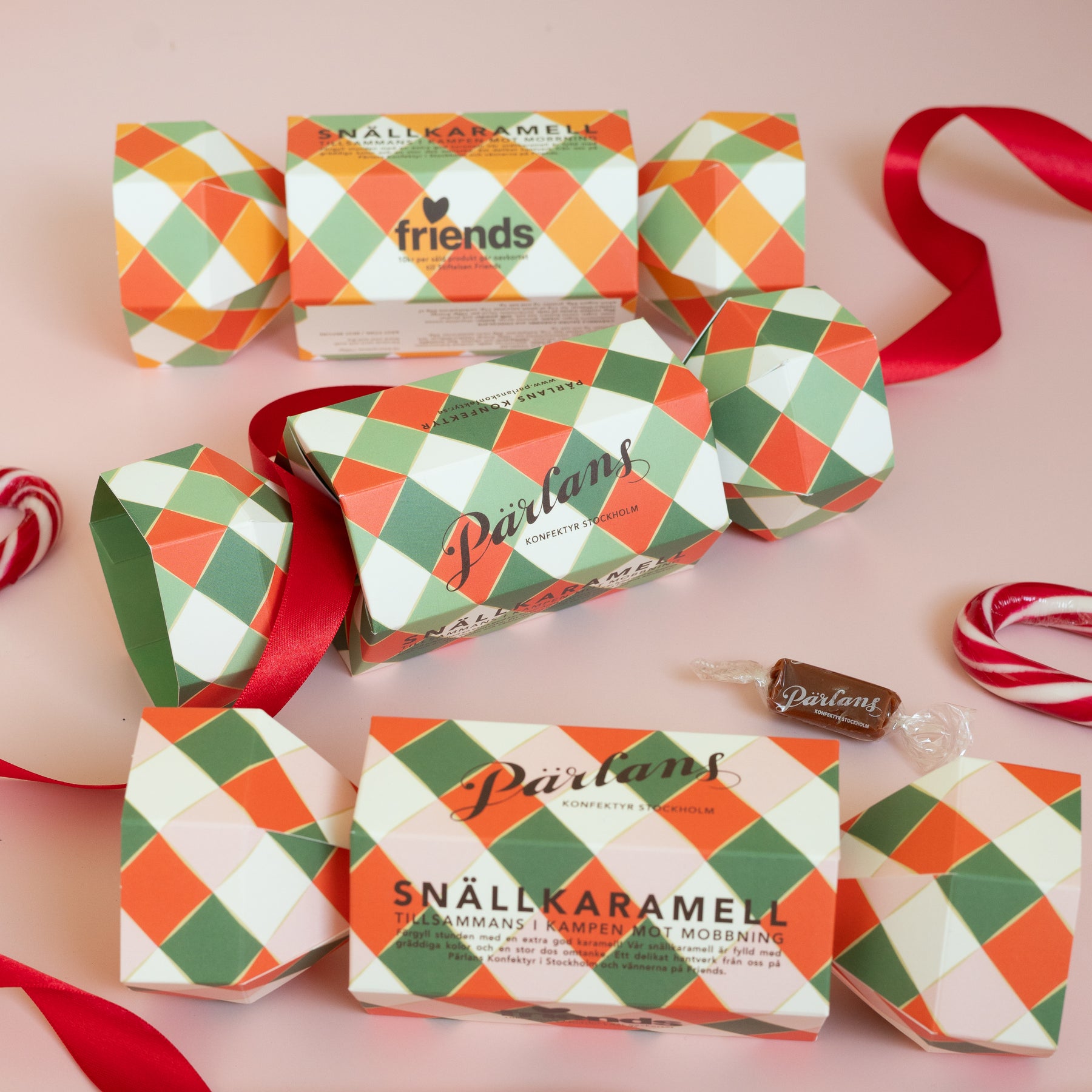 I år är vår smällkaramell särskilt god. Förutom gräddiga kolor i smakerna SALT KARAMELL och CHOKLAD, så är den också fylld med snälla handlingar som kan göra stor skillnad. För varje såld produkt skänker vi oavkortat 10kr till våra vänner på Friends och kampen mot mobbning. Pryd hem och hus med vår SNÄLLKARAMELL och låt det bli början på en snällare värld.