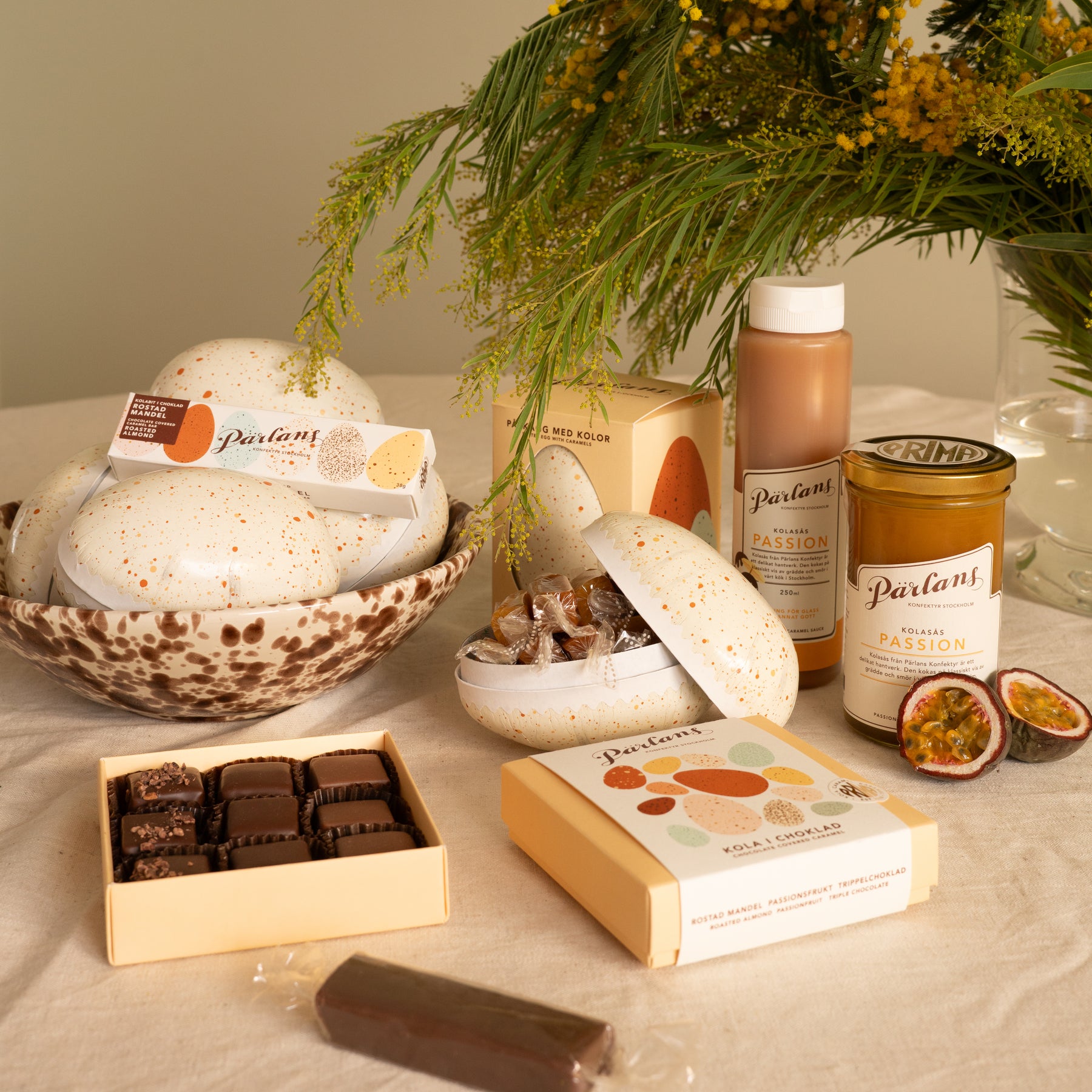 Nio bitar mjuk kola doppad i mörk eller ljus ekologisk choklad. I asken hittar du påskens godaste smaker som väcker våren till liv - rostad mandel med lätt sälta, syrlig passionsfrukt och mustig chokladkola toppad med kakaokross.