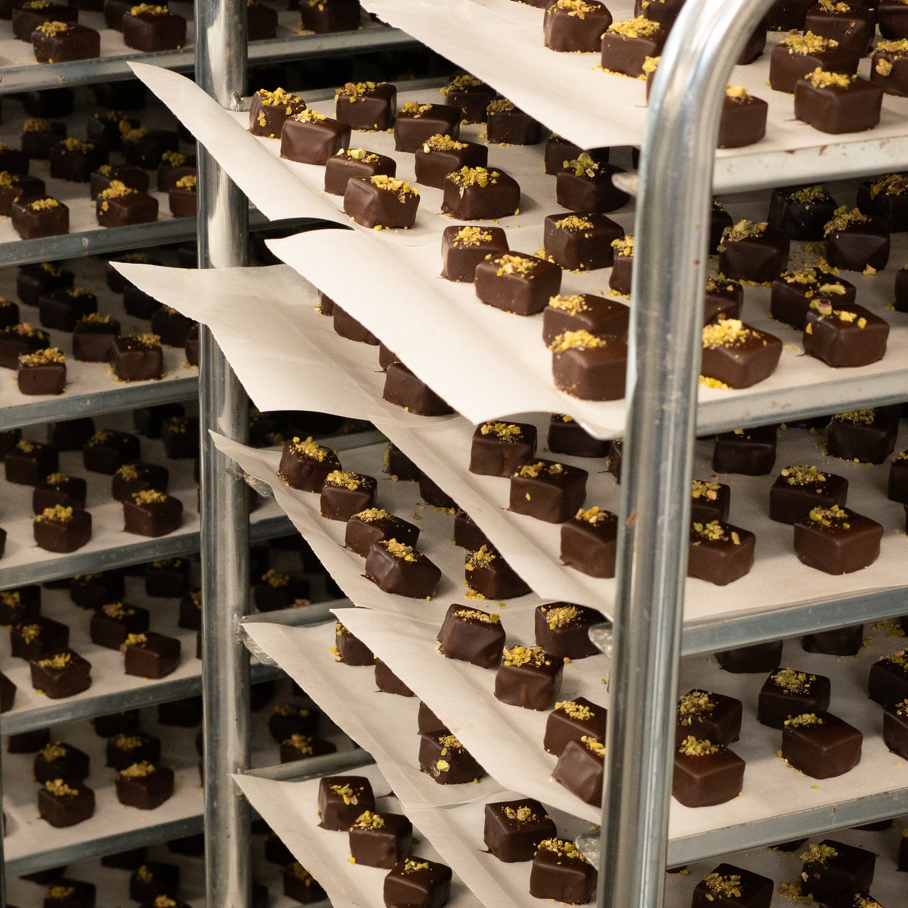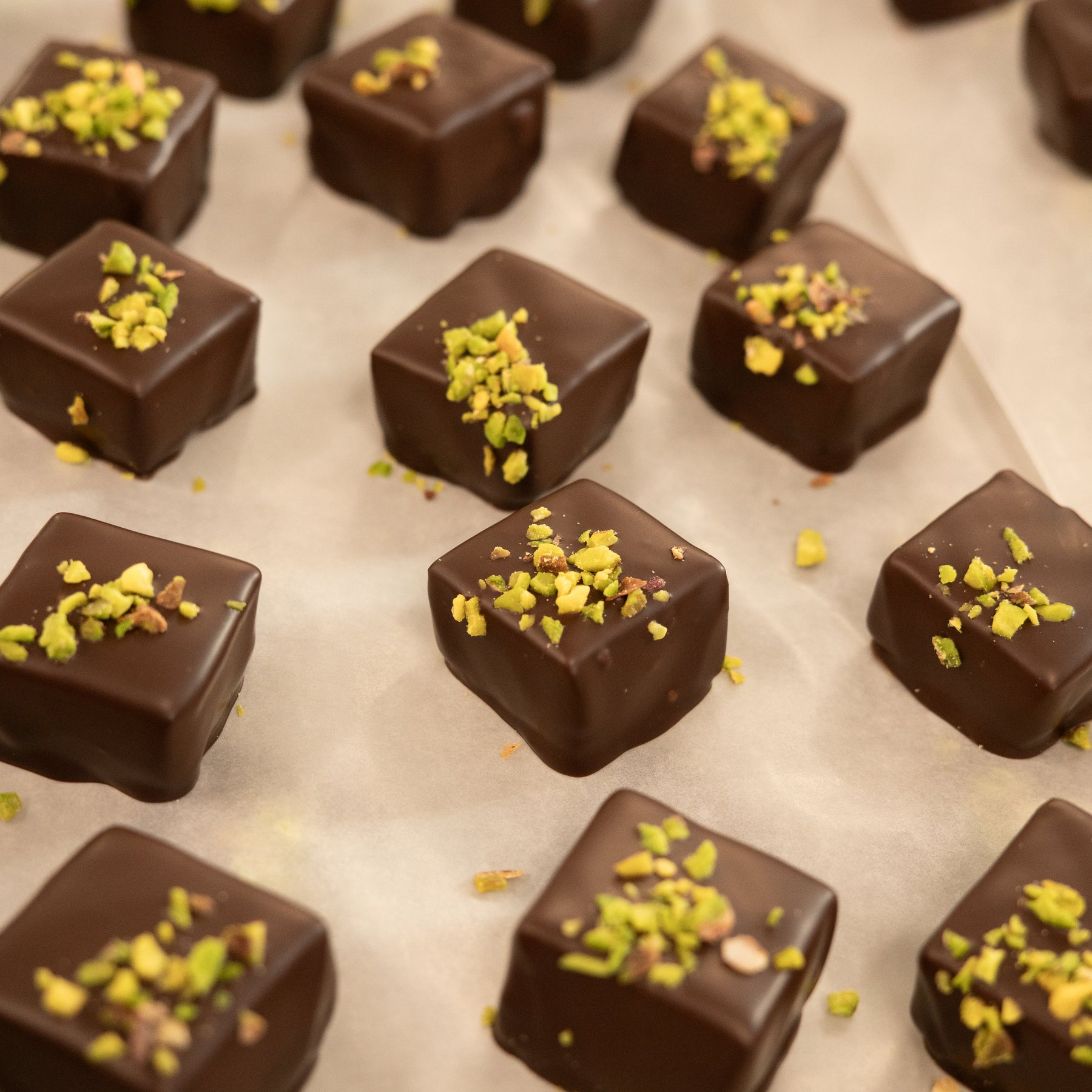 PISTACHIO - smooth caramel with sea salt, with generous pieces of gently roasted pistachios in a thin layer of dark chocolate. The perfect combination of nutty and creamy!