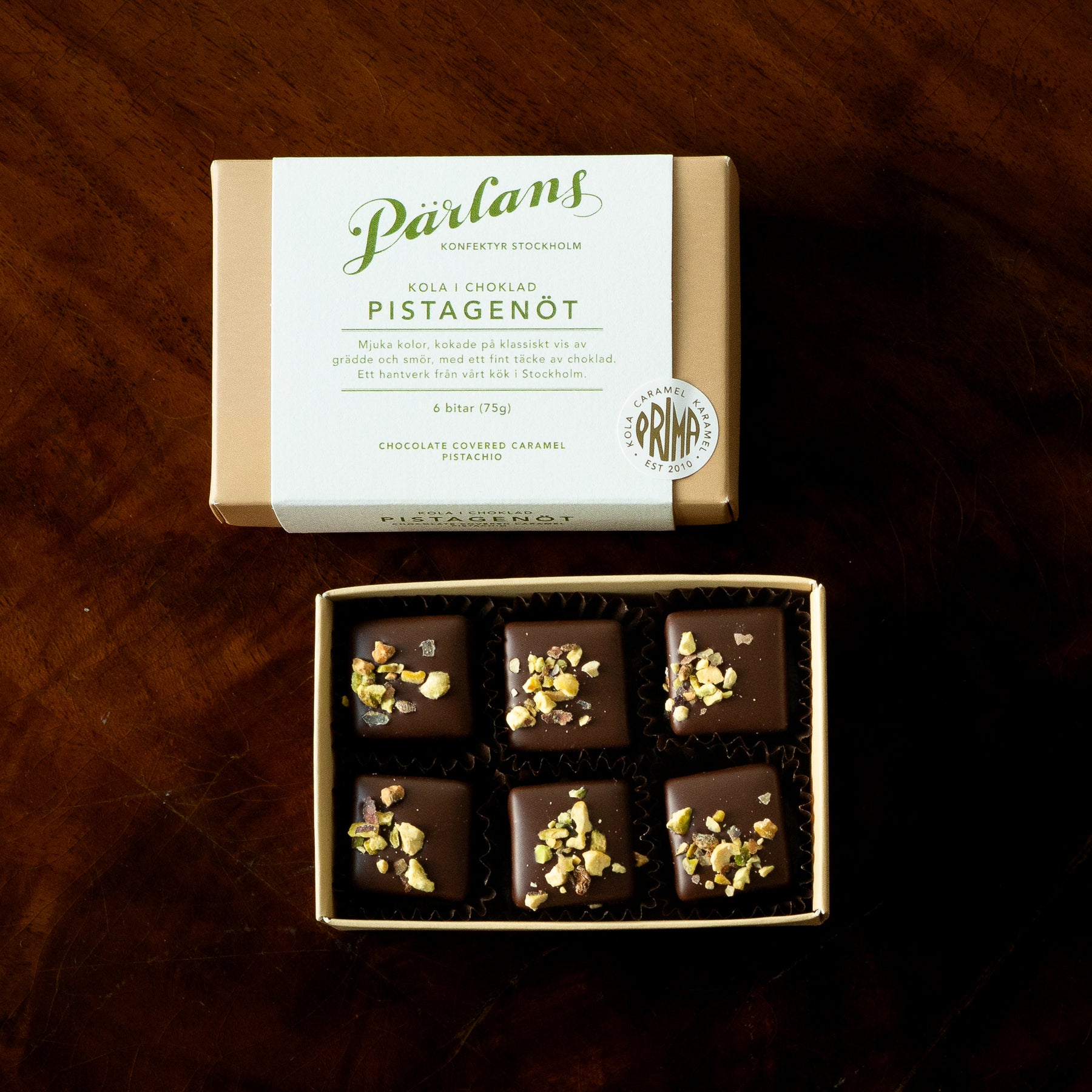 INGREDIENTS Sugar, cream, glucose syrup, butter, choklad (kakaomassa, socker, kakaosmör, emulgeringsmedel solroslecitin), pistachios and sea salt May contain traces of other nuts. Best within 12 weeks. 6 pieces (75g).
